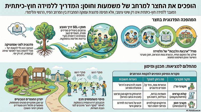 השיח על "למידה חוץ־כיתתית" עבר בשנה האחרונה מהפך: זה כבר לא טרנד של בתי ספר אנתרופוסופיים או נישה למשוגעים לדבר. זוהי מדיניות. משרד החינוך, הרשויות המקומיות וארגונים מובילים מבינים כיום שעיצוב הסביבה הפיזית הוא הכלי הפדגוגי החזק ביותר לטיפול בבעיות אלימות, קשב וחוסן נפשי.