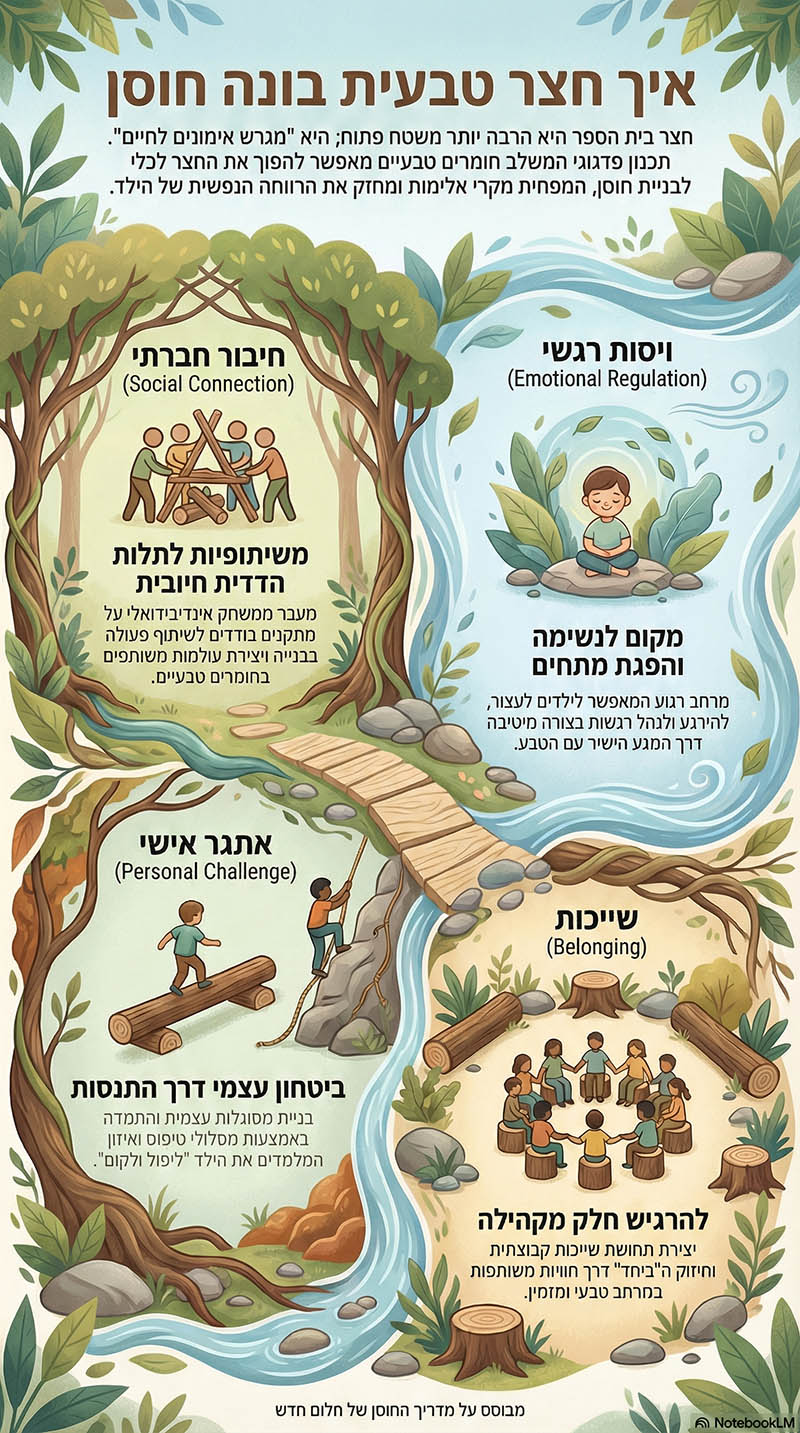 2. חוסן (Resilience) כצורך קיומי המציאות הישראלית מחייבת אותנו לבנות "שרירי חוסן". הדגש החדש הוא על יצירת מרחבים המאפשרים ויסות רגשי. בית הספר נדרש להיות עוגן של יציבות, והחצר צריכה להציע פינות המאפשרות שקט, התכנסות ועיבוד רגשי, לצד מקומות לפריקת אנרגיה מבוקרת.